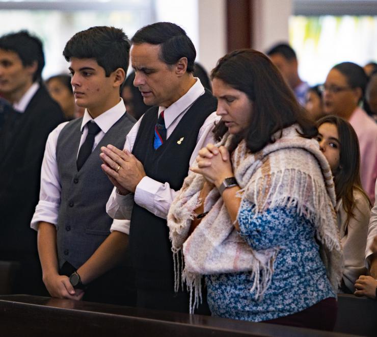 Listening to the homily at the Serra Club's annual Altar Server Awards ceremony, April 30, 2023, from left: Elisabeth Klug-Pulido, Daniela Pulido, Maria Fernanda Castellanos, and her son and altar server, Mateo Otero, 12, and Maria Pilar-Nunez. Miami Auxiliary Bishop Enrique Delgado celebrated Mass and handed out the awards along with Father Matthew Gomez, archdiocesan vocations director, at St. Raphael Chapel on the campus of St. John Vianney College Seminary in Miami.