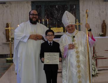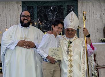 Gia Chau, 14, received an altar server award for his participation at St. Louis Church in Pinecrest. The Palmetto Middle School student arrived in the United States five years ago with his family from Ho Chi Minh City, Vietnam, where they attended Tan Thai Son Church. Gia is following in the footsteps of his father, Choung Nguyen, as an altar server. He came to the event with his parents, grandmother and little sister. His family have always been devout Catholics, he said. Being an altar server is a family tradition.