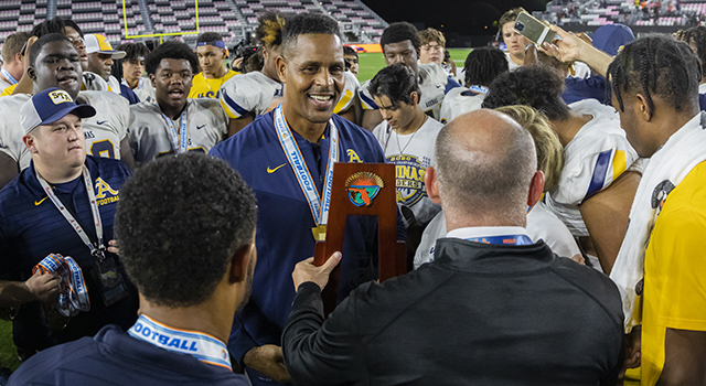 St. Thomas Aquinas athletic director Twan Russell receives the Class 7A State championship trophy from FHSAA director of athletics Robbie Lindeman. Aquinas defeated Tampa Bay Tech, 42 to 14 at DRV PNK Stadium in Fort Lauderdale, Dec. 17, 2021.
