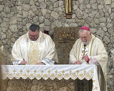 Archbishop Thomas Wenski, right, and Father Ryan Saunders sign documents declaring Father Saunders pastor of St. David Parish in Davie, Oct. 12, 2025.