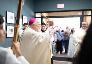 Archbishop Thomas Wenski sprinkles holy water during the rededication of O'Reilly Parish Hall in honor of the founding pastor, Father Gabriel O'Reilly, at St. David Parish in Davie, Oct. 12, 2025.