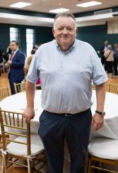 Hubert O'Reilly Sr., brother of Father Gabriel O'Reilly, founding pastor of St. David Parish in Davie, poses for a photo during the reception following Mass and the rededication of O'Reilly Parish Hall, Oct. 12, 2025.