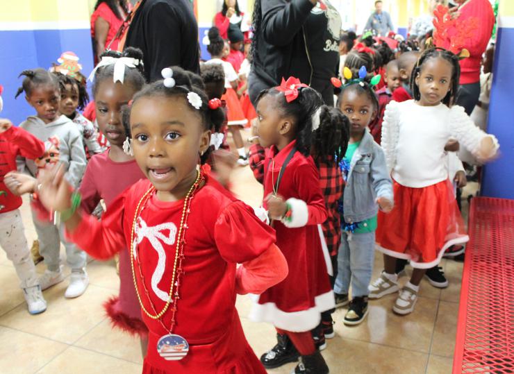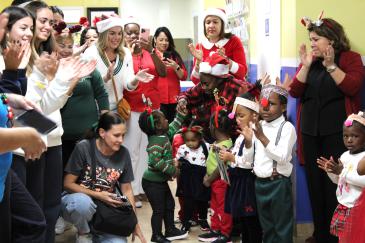 During previous gifting days, students and guests from Lourdes Academy visited each classroom at the center. This year, all the children and teachers gathered in the hallway for a festive block party. Several classes prepared holiday songs to sing or dance to, and music and laughter filled the air. After each performance, many high fives and hugs were given to the Lourdes team, who also received handwritten and colored “thank-you” notes.