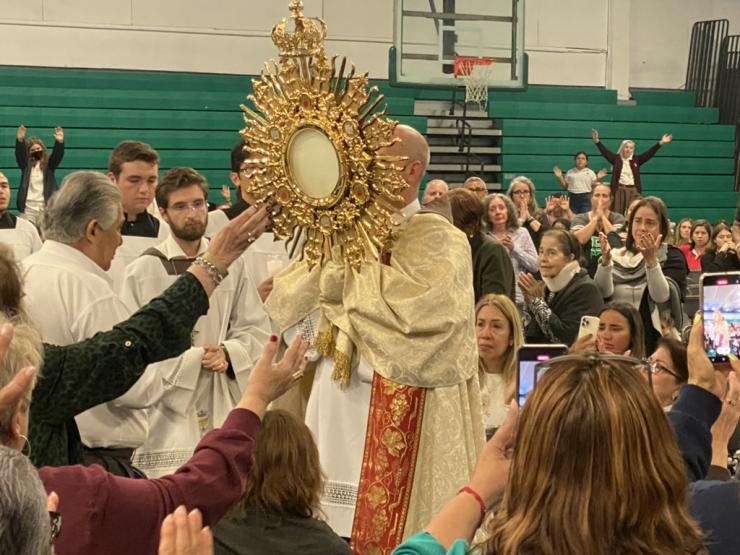 Attendees adore Jesus in the Blessed Sacrament at the culmination of the “I Will Always Be With You” Eucharistic Retreat at St. Brendan High School, June 10, 2023.