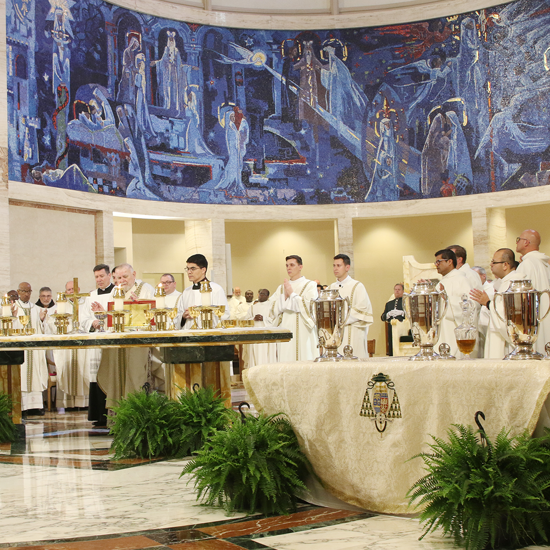 MIAMI | Nearly 200 priests and five bishops gathered at St. Mary Cathedral for the annual Chrism Mass, celebrated by Archbishop Thomas Wenski on the Tuesday of Holy Week, March 31, 2026. During the celebration, Archbishop Wenski blessed the holy oils that will be used in parishes throughout the year for the sacraments of baptism, confirmation, and the anointing of the sick.
