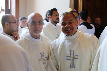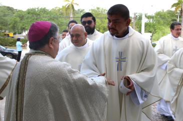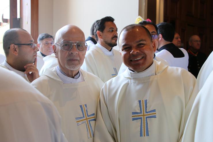 Father Edivaldo da Silva Oliveira, chaplain at Archbishop Edward McCarthy High in Southwest Ranches, greets Miami Auxiliary Bishop Enrique Delgado during the procession of priests for the Chrism Mass, celebrated March 31, 2026 at St. Mary Cathedral, Miami.