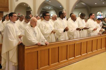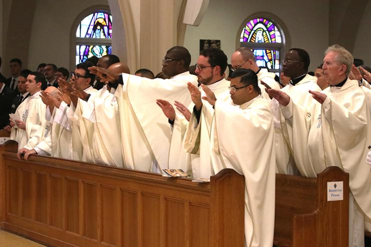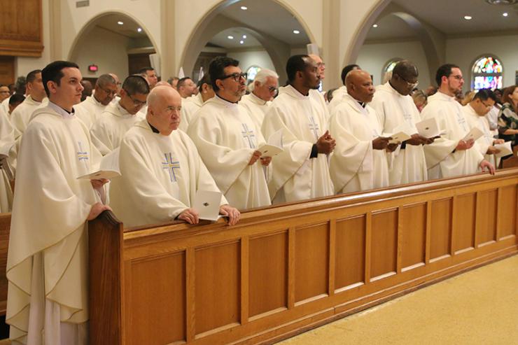 Priests of the Archdiocese of Miami stand during the Chrism Mass on March 31, 2026 at St. Mary Cathedral, Miami.