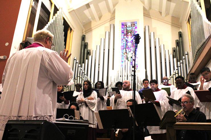 Maximilian Tenney, Director of Sacred Music for the Archdiocese of Miami, leads the choir and orchestra during the Chrism Mass on March 31, 2026 at St. Mary Cathedral, Miami.