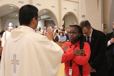 A student from Monsignor Edward Pace High, Miami Gardens, receives a blessing from Father Milton Martinez Blass during the Chrism Mass on March 31, 2026 at St. Mary Cathedral, Miami.