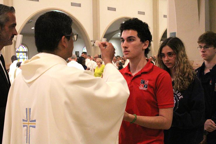 Students from Chaminade-Madonna College Prep, Hollywood, receive Communion from Father Milton Martinez Blass during the Chrism Mass on March 31, 2026 at St. Mary Cathedral, Miami.