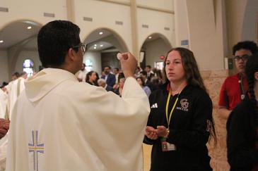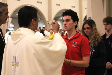 A student from Cardinal Gibbons High, Fort Lauderdale, receives Communion from Father Milton Martinez Blass during the Chrism Mass on March 31, 2026 at St. Mary Cathedral, Miami.