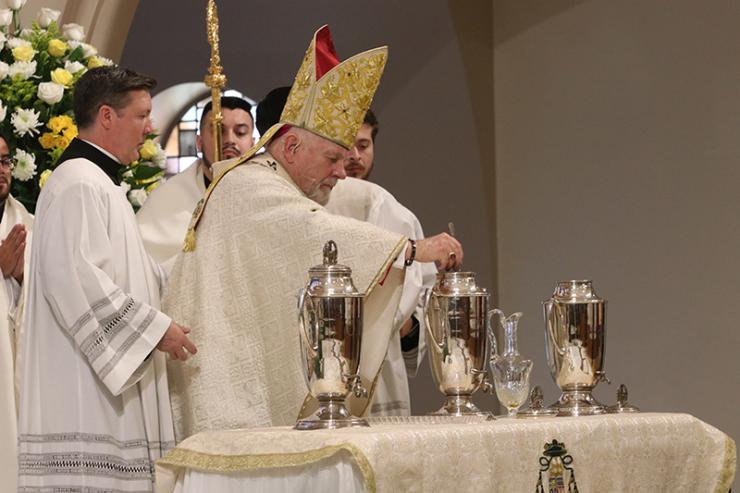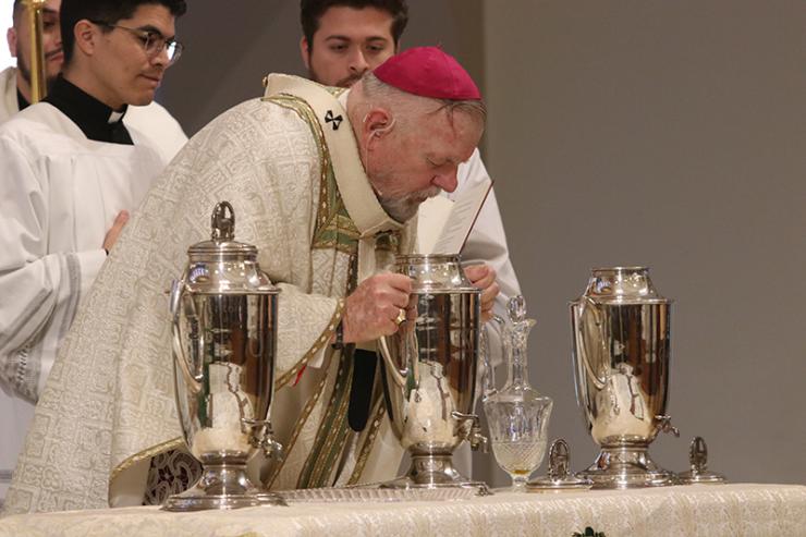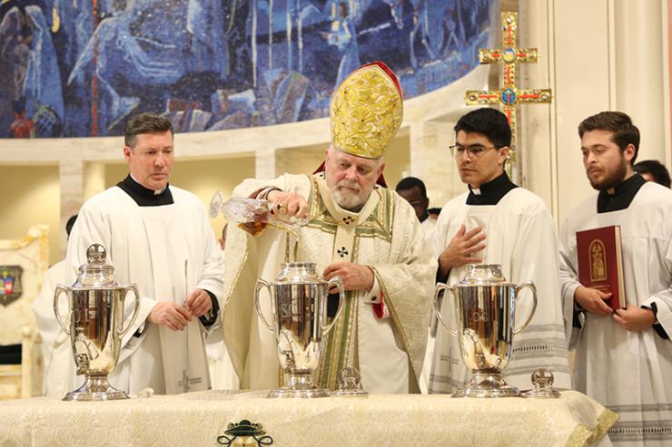 Archbishop Thomas Wenski pours balsam oil into the oil of chrism during the Chrism Mass on March 31, 2026 at St. Mary Cathedral, Miami. Chrism oil is used at baptisms, ordinations of priests and bishops, the consecration of churches and blessings of altars.