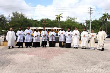 Deacons and seminarians of the Archdiocese of Miami stand outside of St. Mary Cathedral, Miami, at the conclusion of the Chrism Mass on March 31, 2026.