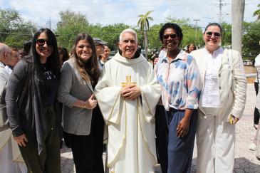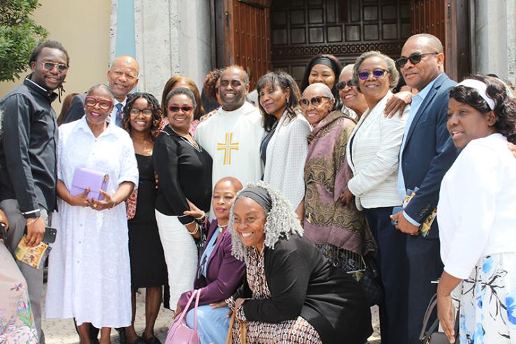 Parishioners and friends of Father Reginald Jean-Mary, pastor of Notre Dame d'Haiti in Miami, pose with him after