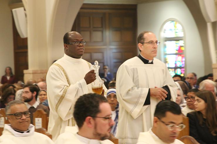 Deacon Saint-Clos Papouloute, left, accompanied by Deacon Sergio Rodicio, brings up the balsam, an aromatic resin used to perfume the oil of chrism during the Chrism Mass celebrated March, 31, 2026. Chrism is used at baptisms, confirmations and the consecration of priests, bishops and churches. (ROCIO GRANADOS | LVC)