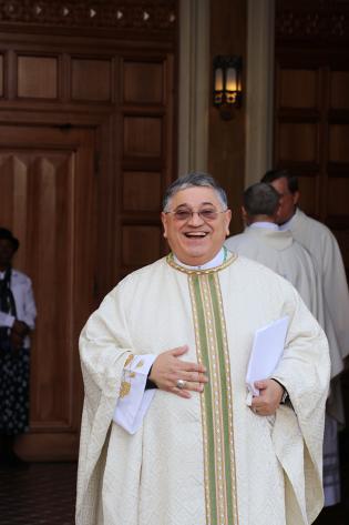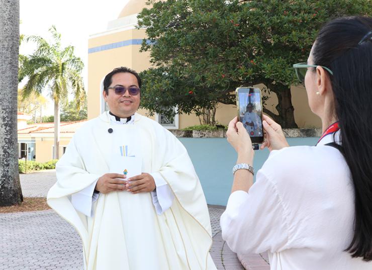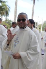 Father Edgardo 'Gary' De Los Santos, parochial vicar at St. Ambrose Church in Deerfield Beach, smiles at the camera while processing into St. Mary Cathedral for the chrism Mass, March 31, 2026. (ROCIO GRANADOS | LVC)