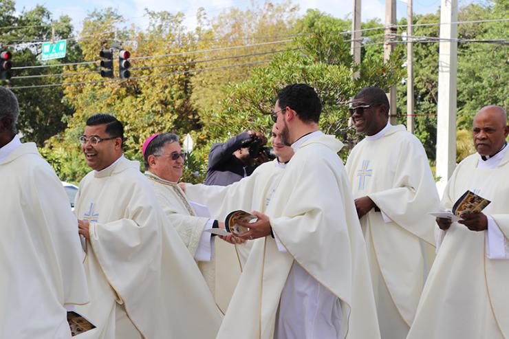 Priests of the Archdiocese of Miami process into St. Mary Cathedral for the Chrism Mass March 31, 2026.