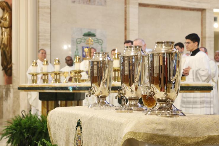 The holy oils - of anointing of the sick, chrism, and catechumens - rest atop a table on the cathedral sanctuary. (ROCIO GRANADOS | LVC)