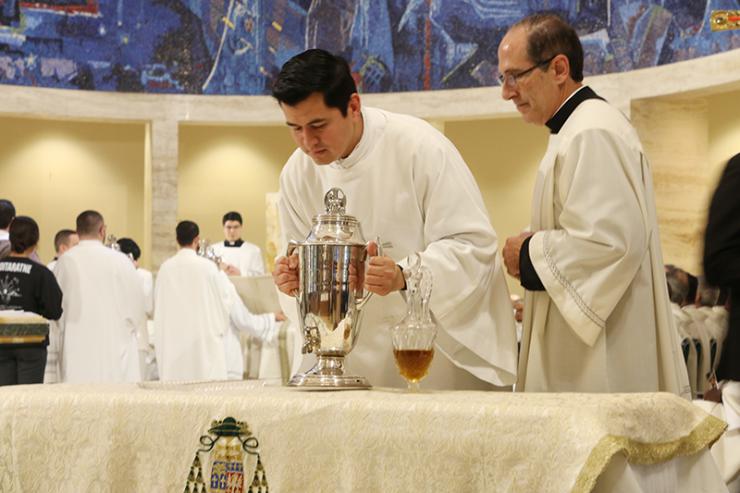 Deacon Cristhian Mendieta places the oil of chrism after presenting it to the archbishop. This oil is used in the anointing of the sick. Deacon Sergio Rodicio of the Office of Worship looks at him. (ROCIO GRANADOS | LVC)