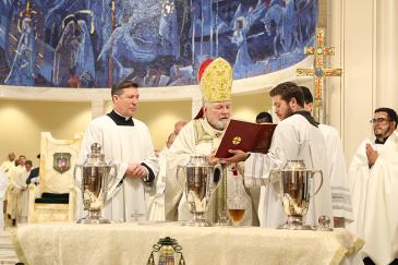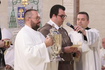 Deacon Tomasz Koziel and Brother Emilio Perez from the Servants of Pierced Hearts of Jesus and Mary, take up the oil of the catechumens during the offertory of the chrism Mass celebrated at St. Mary Cathedral, March 31, 2026.