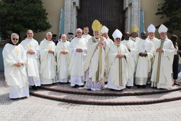 Jubilarians and concelebrating bishops pose for a photo with Archbishop Thomas Wenski after the chrism Mass March 31, 2026. From left: Franciscan Father Nicholas Mormando, Father Jorge Rodríguez de la Viuda, Father Norberto López, Father Joaquín Pérez-Pupo, Piarist Father Félix Ganuza, Father Attila Frohlich, Bishop Silvio Báez, Miami Auxiliary Bishop Enrique Delgado, Father Reginald Jean-Mary, Bishop Pierre-André Dumas, Father Eddy Horace, Chorbishop Michael Thomas and Bishop Fernando Isern.