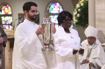 Deacon Carlos Luzardo, accompanied by Ifensae Doudou of St. Mary Cathedral, presents the oil of the sick to the archbishop during the offertory of the chrism Mass celebrated at St. Mary Cathedral, March 31, 2026.