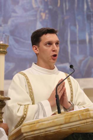 Deacon Pietro Pironato proclaims the Gospel at the chrism Mass at St. Mary Cathedral, March 31, 2026. (ROCIO GRANADOS | LVC)