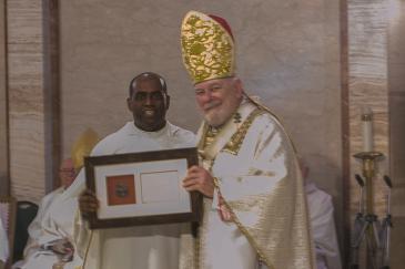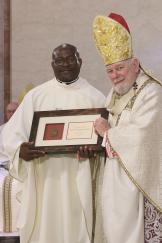 Father Eddy Horace receives a plaque commemorating his 25 years of priesthood from Archbishop Thomas Wenski during the chrism Mass at St. Mary Cathedral, March 31, 2026.