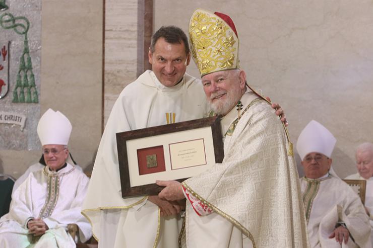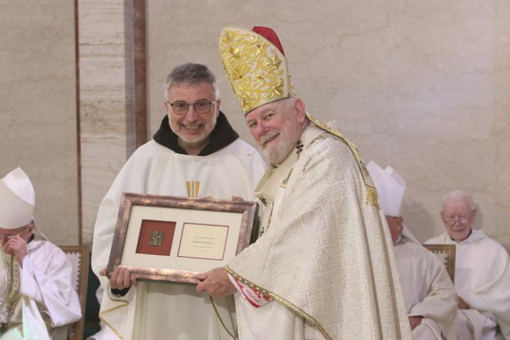 Franciscan Father Nicholas Mormando, guardian of the St. Pio Capuchin Friary in Fort Lauderdale, receives a plaque commemorating his 25 years of priesthood from Archbishop Thomas Wenski during the chrism Mass at St. Mary Cathedral, March 31, 2026.