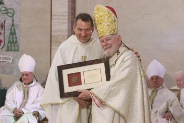Piarist Father Félix Ganuza, parochial vicar of St. John the Apostle Parish in Hialeah, receives a plaque commemorating his 50 years of priesthood from Archbishop Thomas Wenski during the chrism Mass at St. Mary Cathedral, March 31, 2026.