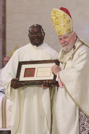 Father Reginald Jean-Mary, pastor of Notre Dame DÕHaiti Mission in Miami, poses with Archbishop Thomas Wenski after the Chrism Mass at St. Mary Cathedral, March 31, 2026. During the Mass, Father Jean-Mary received a plaque commemorating his 25 years of priesthood.