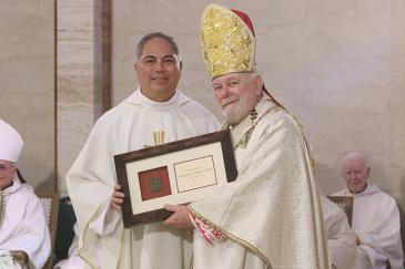 Father Jorge Rodríguez de la Viuda, pastor of Bernard Church in Sunrise, receives a plaque commemorating his 25 years of priesthood from Archbishop Thomas Wenski during the chrism Mass at St. Mary Cathedral, March 31, 2026.