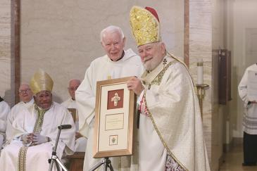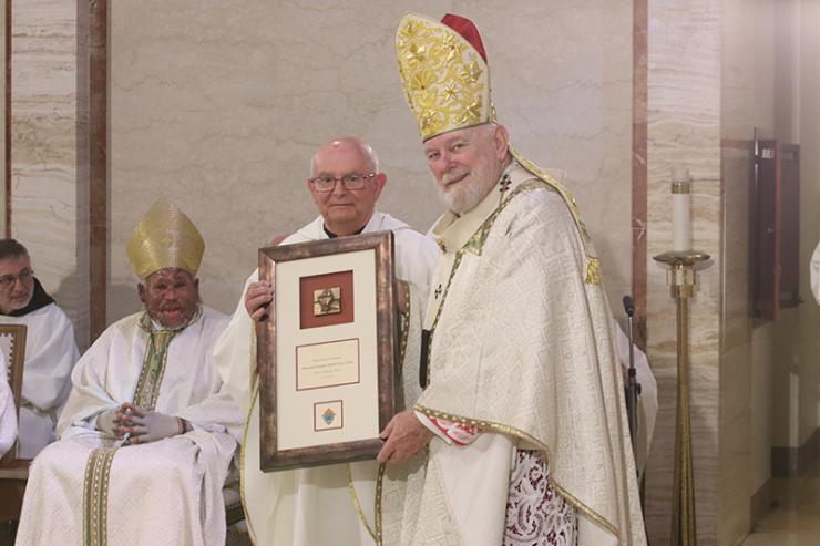 Father Dominick Joseph O’Dwyer receives a plaque commemorating his 50 years of priesthood from Archbishop Thomas Wenski during the chrism Mass at St. Mary Cathedral, March 31, 2026.