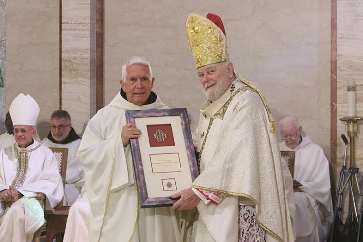 Benedictine Father Norberto A. López receives a plaque commemorating his 50 years of priesthood from Archbishop Thomas Wenski during the chrism Mass at St. Mary Cathedral, March 31, 2026.