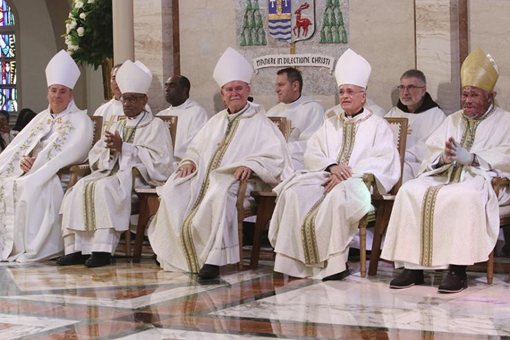 Concelebrating bishops listen to the readings during the chrism Mass. From left: Chorbishop Michael Thomas of Heart of Jesus Maronite Catholic Church in Fort Lauderdale; Bishop Joseph Lafontant, emeritus of Port-au-Prince, Haiti; Bishop Fernando Isern, emeritus of Pueblo, Colorado; Bishop Silvio Báez, auxiliary of Managua, Nicaragua; and Bishop Pierre-André Dumas of Anse-à-Veau-Miragoâne, Haiti.