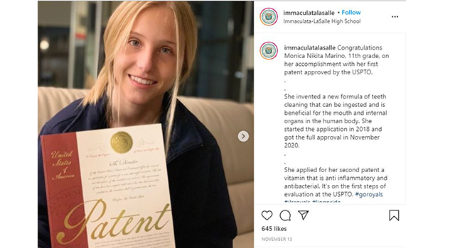 Making the school news: Nikita Marino made Immaculata La Salle news in November 2020 when she received the approval of her Bite Bright toothpaste formula, which she began in 2017. Nikita is a junior at the school, and is working on her second patent.