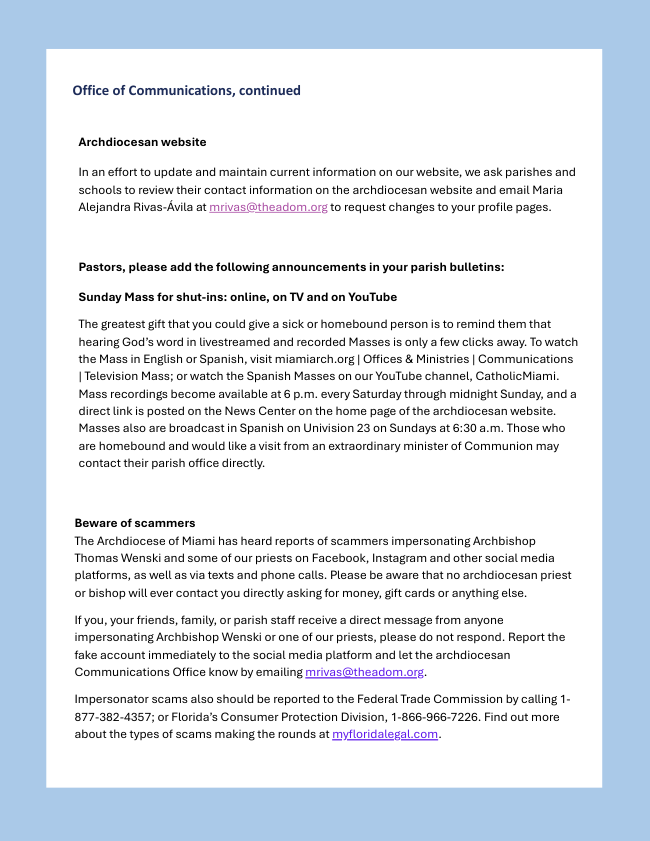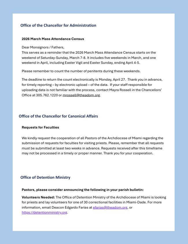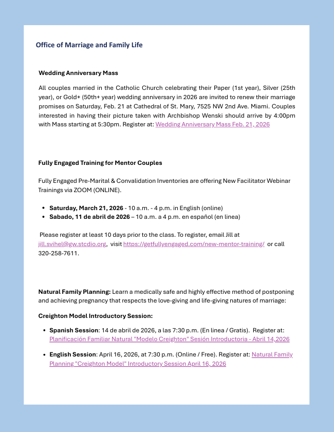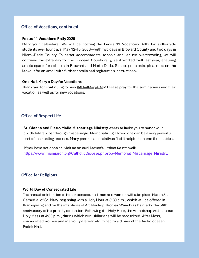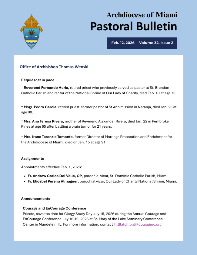 The Archdiocese of Miami welcomes input in response to the current news article posting. However, the Archdiocese reserves the right to deny posting any information or comment that does not adhere to the teachings of the Catholic Church. Comments will not be posted if they contain insults, ethnic slurs, personal attacks or obscenities, or if they are not in keeping with charity, civility and the standards and teachings of the Archdiocese of Miami and the Catholic Church.