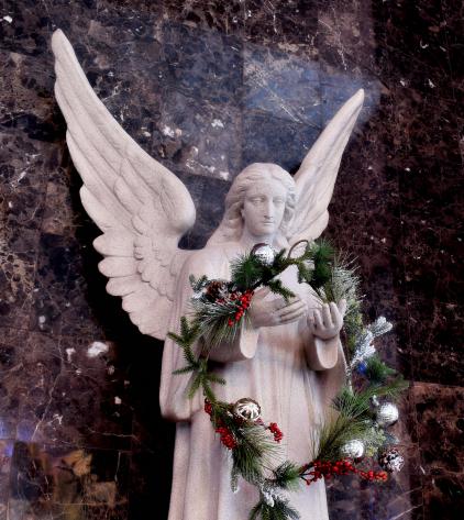 Someone whimsically placed a Christmas wreath in the hands of an angel statue.