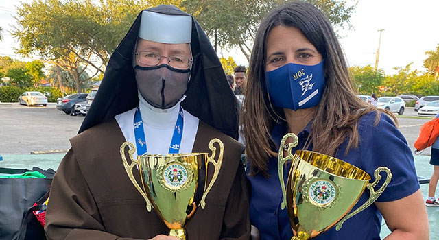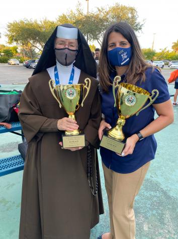 The principals of the winning schools at St. Brendan High School's Academic Olympics, Carmelite Sister Rosalie Nagy, of St. Theresa School in Coral Gables, and Yesi Feria De La Torre, of Mother of Christ School in Miami, pose with their respective first place trophies after the competition, Oct. 20, 2021. St. Theresa won first place in the Large School Division, Mother of Christ in the Small School Division.