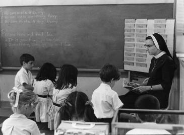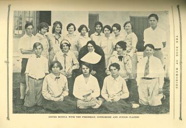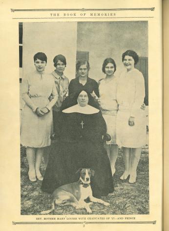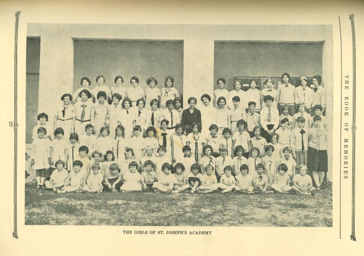 A photo taken in the 1930s reveals students of St. Joseph Academy outside in their schoolyard in conversation with a Sister of St. Joseph of St. Augustine. Nearby, other sisters of the order can be seen, as they were educators at the school. Today, the school is known as St. Theresa School, and is celebrating their centennial.