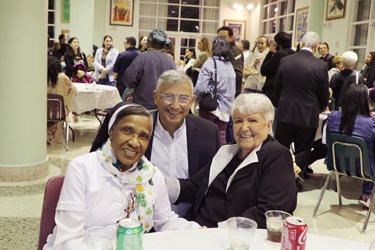From left, parishioners Guadalupe Mendoza and Isaura Uriel of St. Patrick Parish in Miami Beach pose with Sister Claudina Sanz, of the Oblate Sisters of Providence, catechist and youth minister at the church, during the reception after the Mass commemorating the 100th anniversary of the parish on St. Patrick’s Day, March 17, 2026.