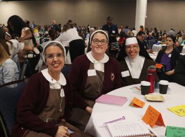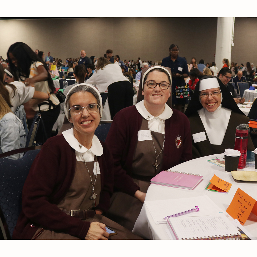 Servants of the Pierced Hearts of Jesus and Mary, Sister Michelle Fernandez, a religion teacher, left, and Sister Rose Marie Koos, involved in campus ministry, both from Little Flower School in Hollywood, pose for a picture with Sister Mary Louise Marck, a religion teacher at Archbishop Coleman Carroll High School in Miami. They were among more than 2,000 teachers who attended the Catholic Schools Professional Development Day, held Sept. 27, 2024 at the Broward Convention Center in Fort Lauderdale.
