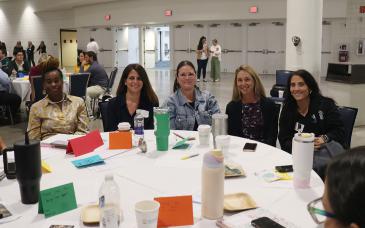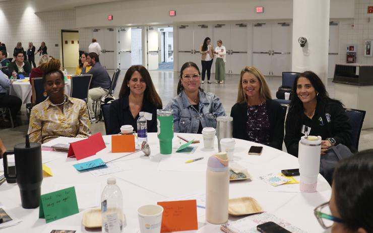 From left to right, Kristen Henderson, Pre-K teacher at Immaculate Conception School; Bianca Acosta, principal at Immaculate Conception School in Miami; Emily Bufford, PK2 teacher at Mary Help of Christians School in Parkland; Elba Hernandez, middle school teacher at St. Bernadette School in Hollywood; Lina Medina, PK teacher at St. Maximillian Colbe Pre-School in Pembroke Pines. They were among the 2,000 teachers who attended the Catholic Schools Professional Development Day, held Sept. 27, 2024 at the Broward Convention Center in Fort Lauderdale.