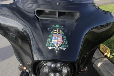 After Mass, the archbishop blessed the motorcycles with holy water while riding on a golf cart around the parking lot. The 50-mile motorcycle ride began with kickstands up at 10 a.m., with the archbishop at the front of the line on his black Harley Davidson Street Glide. The long procession featured motorcycles of many colors, including cherry red, teal, yellow, and orange, with the Rubenstein Law motorcycle sporting the American flag.