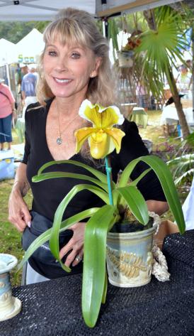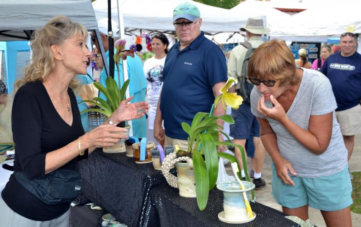 Juanita Contreras talks orchid care with John Erickson of Lower Matecumbe Key at the Art Under the Oaks Festival. It's the 12th festival at San Pedro Church for Contreras, a member at St. Ann Church.
