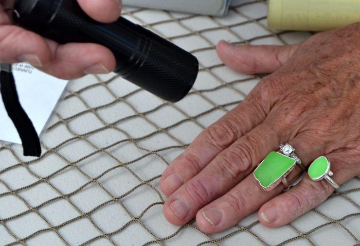 - Seaglass pebbles glowed an eerie green under Denise Tunney's flashlight. She said they were laced with uranium, a common practice before 1920.