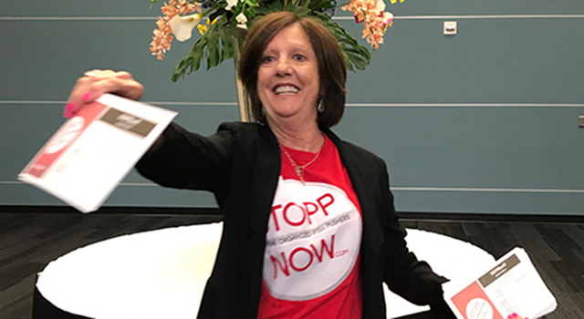 Opioid activist and STOPPNow author Janet Colbert hands out flyers at the Broward County Opioid Epidemic Town Hall Meeting in August 2017. Colbert, a St. David's parishioner and retired neonatal intensive care nurse, championed the cause to end the opioid epidemic and founded STOPPNow in 2011 in response to the drug addicted babies she was caring for at Joe DiMaggio Children's Hospital.