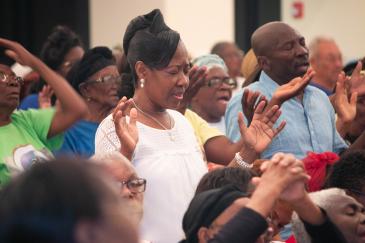 People pray during the fifth night of Jericho 2018 at Notre Dame d'Haiti Mission, Miami.