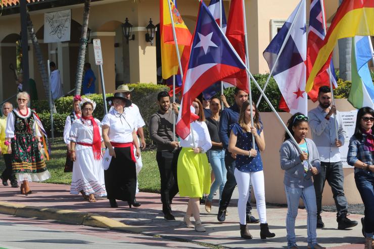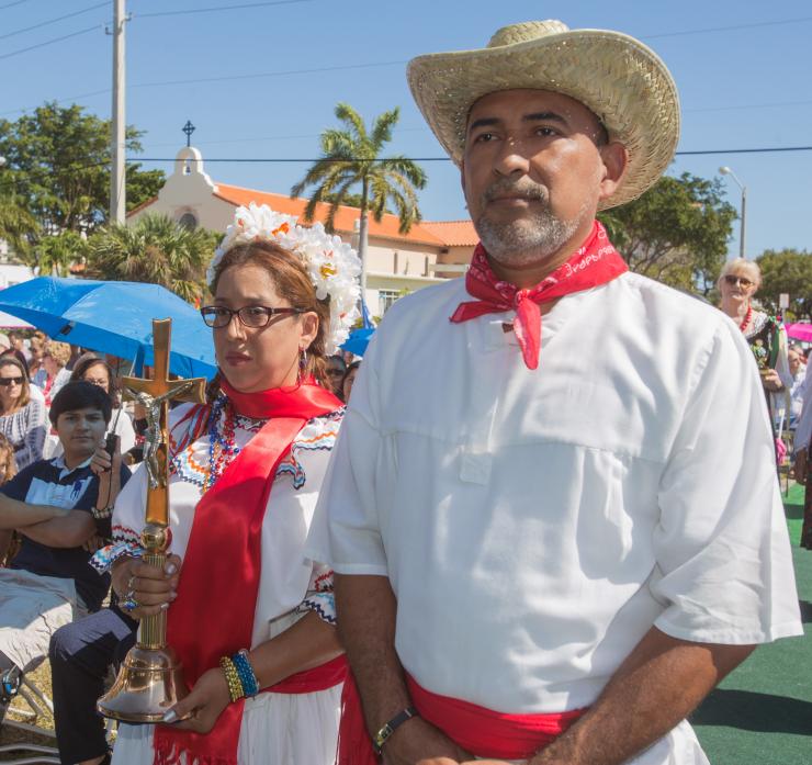Archbishop Thomas Wenski, Father Juan Sosa, pastor, and others process from St. Joseph Church to Mass site across the street. The parish marked its 75th anniversary Feb. 12 with a single outdoor Mass for the entire community.