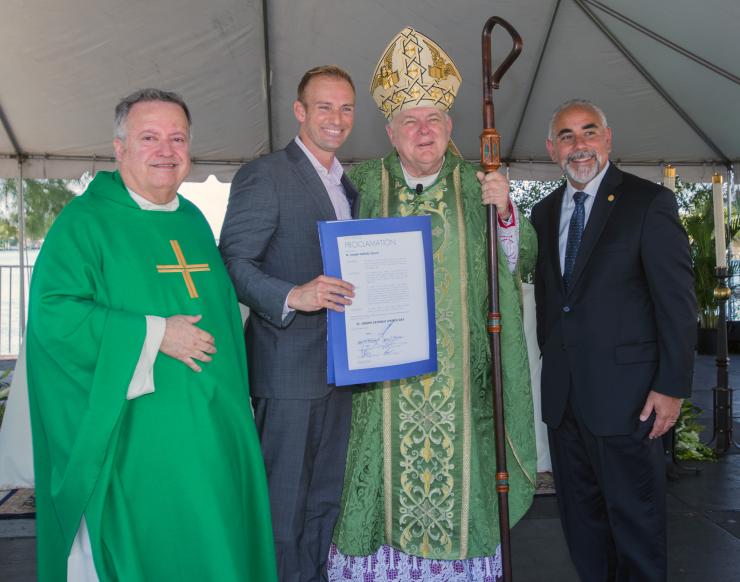 Father Juan Sosa, left, St. Joseph's pastor, poses with Miami Beach Commissioner Michael Grieco, Archbishop Thomas Wenski and Miami Beach City Manager Jimmy Morales, far right, a St. Joseph School graduate. Grieco and Morales presented a proclamation from the City of Miami Beach naming Feb. 12, 2017 "St. Joseph Catholic Church Day" in honor of the parish's 75th anniversary.